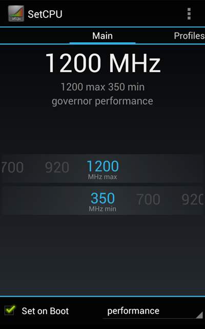 The Set on Boot checkbox allows SetCPU to set the Main tab settings when your device first boots, so you won't have to go back into SetCPU every time you reboot. The Set on Boot checkbox also starts the profiles service if profiles are enabled.